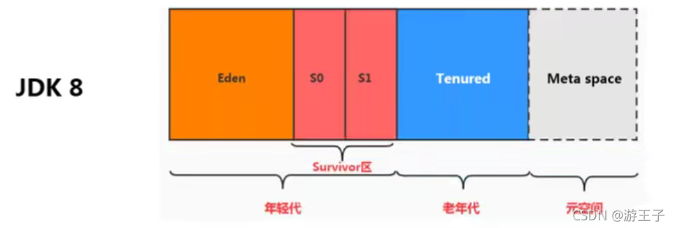 - 新生代:有Eden、两块大小相同的survivor(又称为from/to,s0/s1)构成,to总为空。