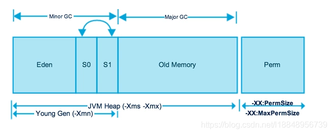 堆默认大小为本机内存的1/4,如本机内存为8G,则堆空间大小默认为2G   Java堆的内存划分如图所示,分别为年轻代、Old Memory(老年代)、Perm(永久代)。其中在Jdk1.8中,永久代被移除,使用MetaSpace(元空间)代替。