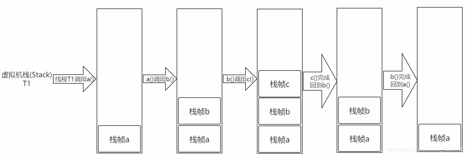 虚拟机栈(Java Virtual Machine Stacks)是一个线程执行的区域,保存着一个线程中方法的调用状态。换句话说,一个Java线程的运行状态,由一个虚拟机栈来保存,所以虚拟机栈肯定是线程私有的,随着线程的创建而创建。每个方法被执行的时候都会同时创建一个栈帧,栈帧是用于支持虚拟机进行方法调用和方法执行的数据结构,即每个方法对应一个栈帧。调用一个方法,就会向栈中压入一个栈帧;一个方法调用完成,就会把该栈帧从栈中弹出。对于执行引擎来讲,活动线程中,只有栈顶的栈帧是有效的,称为当前栈帧,这个栈帧所关联的方法称为当前方法,执行引擎所运行的所有字节码指令都只针对当前栈帧进行操作。  在Java虚拟机规范中,对这个区域规定了两种异常情况: