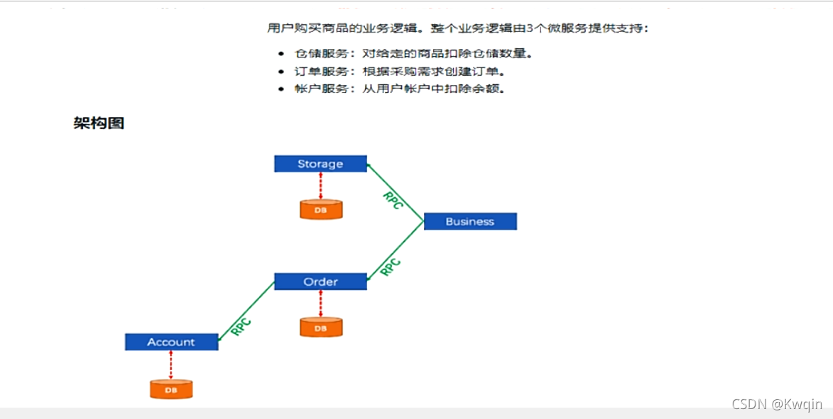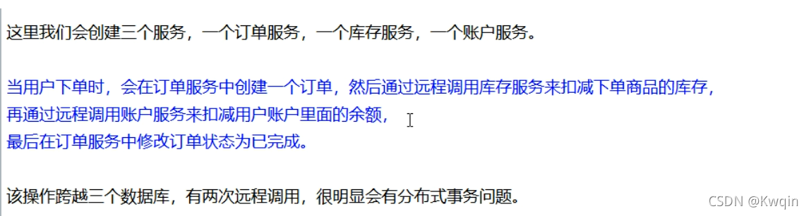 * 创建订单->调用库存服务扣减库存->调用账户服务扣减账户余额->修改订单状态