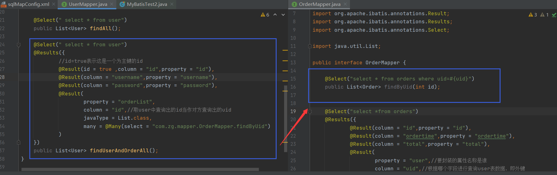 many = @Many(select = "com.zg.mapper.OrderMapper.findByUid")