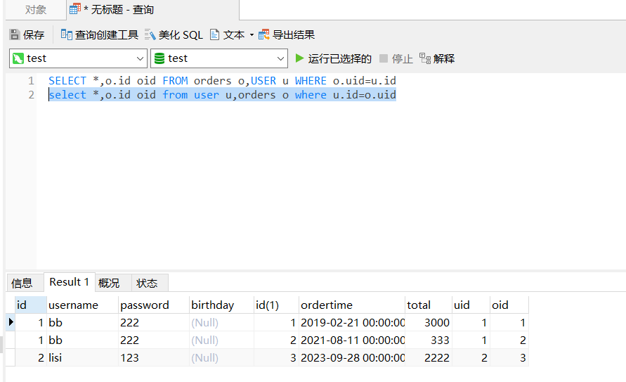 select *,o.id oid from user u,orders o where u.id=o.uid