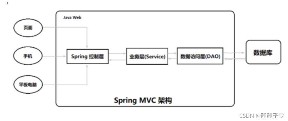 在JavaEE开发中,项目从上到下分层为应用层,web层,业务层,持久层 。SpringMVC属于web层的框架,spring主要是业务层,而mybatis框架是持久层所使用。