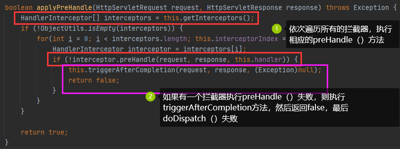 sddss③、先来 顺序执行 所有拦截器的 preHandle方法,如果其中有失败的,则逆序执行相应的afterCompletion()方法。 sdsdssssss sdsdssssss dsdsss【注】:注意逆序执行afterCompletion,有一个小细节,我们用this.interceptorIndex==i++或者–i,说明只有执行完preHandle()方法的拦截器才能逆序执行响应的afterCompletion方法。执行完后,doDispatch()方法就直接return,不会执行目标方法了。