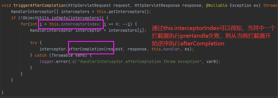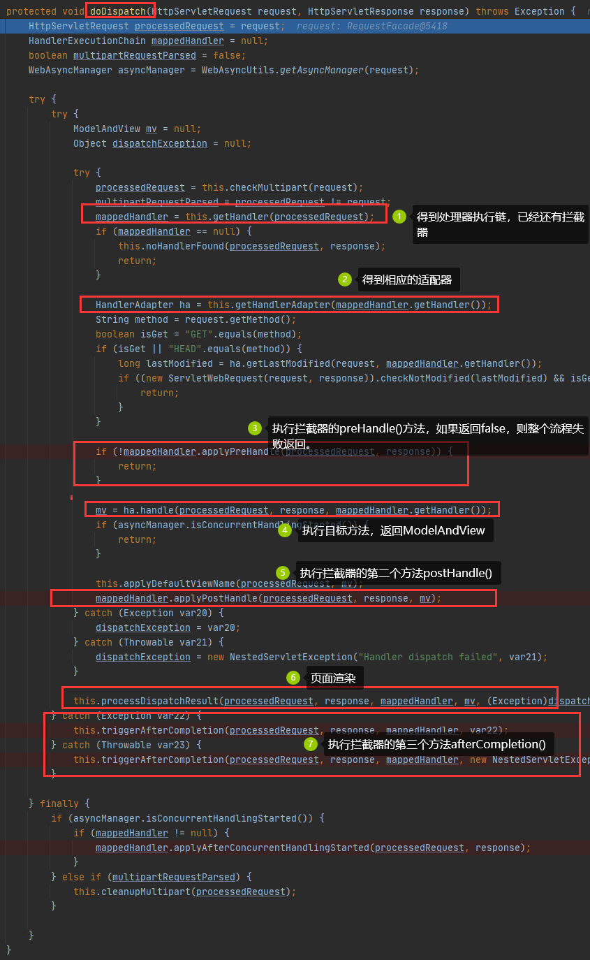 sddss⑦、页面渲染完成后也会触发所有拦截器的 afterCompletion(通过finally里的方法可以得知这一点)。 sddssdsds sddsdsdss并且前面的步骤有任何异常都会直接倒序触发所有拦截器的 afterCompletion。  dsdsss【注】:到此doDispatch()方法就结束了,拦截器的三个方法中 afterCompletion 和 preHandle 一定执行。