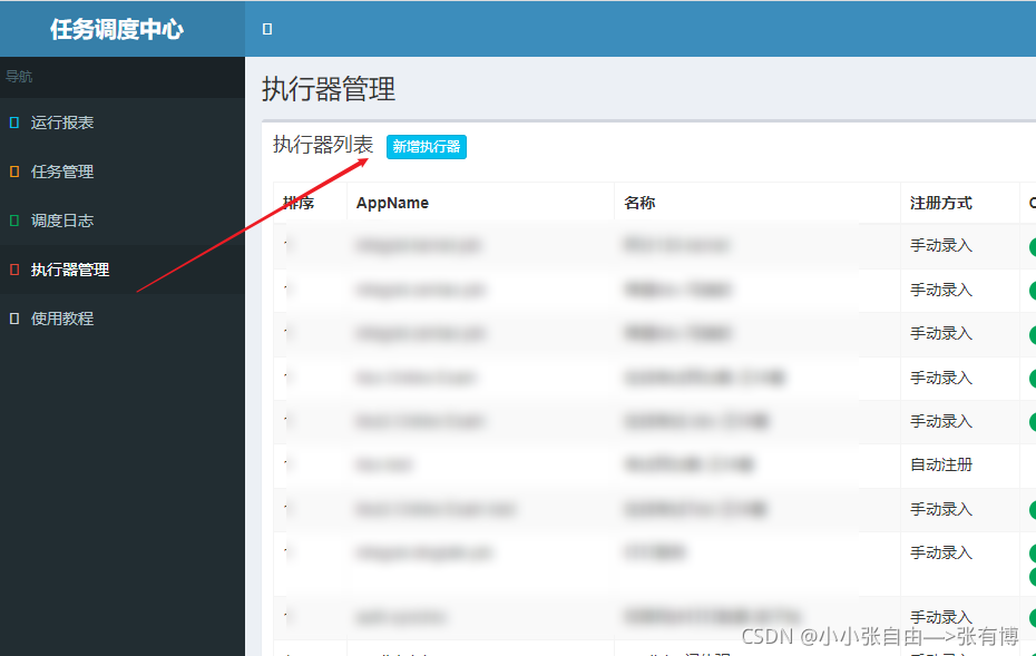 - 5、注册中心: 执行器会周期性自动注册任务, 调度中心将会自动发现注册的任务并触发执行。同时,也支持手动录入执行器地址;
