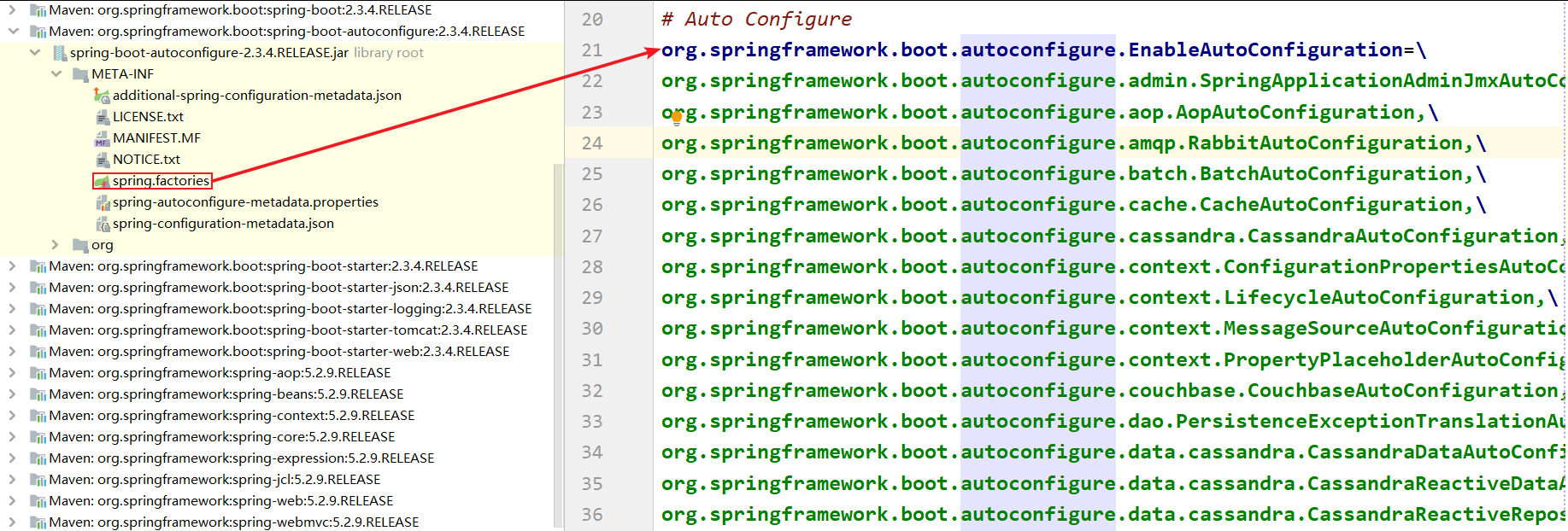 (1). 利用getAutoConfigurationEntry(annotationMetadata);给容器中批量导入一些组件 (2). 调用List configurations = getCandidateConfigurations(annotationMetadata, attributes)获取到所有需要导入到容器中的配置类 (3). 利用工厂加载 Map<String, List> loadSpringFactories(@Nullable ClassLoader classLoader):得到所有的组件 (4). 从META-INF/spring.factories位置来加载一个文件。 默认扫描我们当前系统里面所有META-INF/spring.factories位置的文件 spring-boot-autoconfigure-2.3.4.RELEASE.jar包里面也有META-INF/spring.factories 并不是所有的Bean都会被初始化,在配置类中使用Condition来加载满足条件的Bean