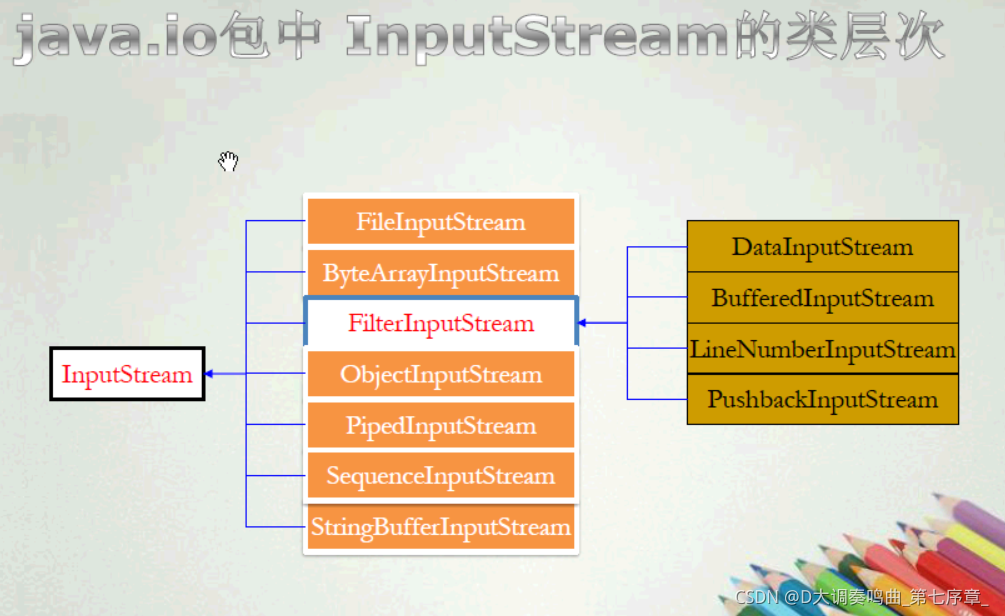 - 输入流: 将 < 存储设备 > 中的内容读入到 < 内存 > 中.
