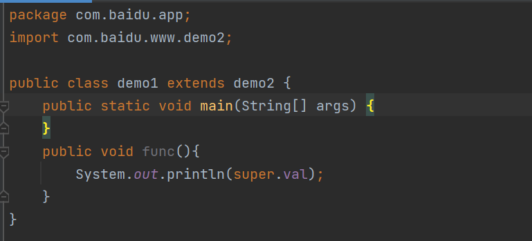 在不同包底下,我们要在子类中导入父类,在进行继承,由于是父子类关系,我们要用super关键字对父类中的实例进行访问(super关键字是不能出现在静态方法中的,因为super是对父类对象的引用,是依赖于对象的,而静态方法是属于类的,不依赖于对象)