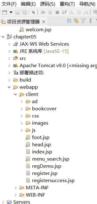 2.文件移植 将传智书城的client文件复制到建立的web项目的webcontent目录下,并将client文件夹下的所有.html文件改为.jsp文件,如图:  3.修改jsp页面中的地址和链接 修改操作已在第一步就写了,就是将