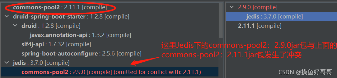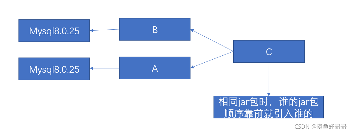 当A←B←C时,A中有mysql8.0.25的架包,B中有mysql5.5的架包,那么这两个架包就有冲突了,C到底会引入谁的mysql jar包呢,依赖的传递性以及依赖的就近原则告诉我们,当这种情况发生,C离谁离得近就引入谁的jar包,所以C会引入B中mysql5.5的架包。在这种依赖关系当中,C对B是直接依赖,对A是间接依赖。