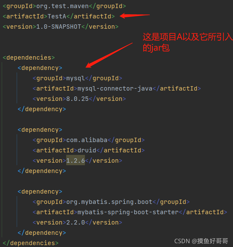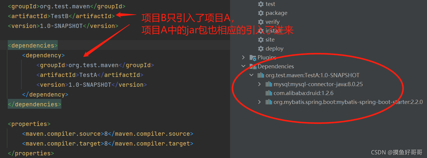 1)依赖的传递性:假设有两个项目,分别为项目A和项目B,如果B引入了A到pom.xml中,那么A所引入的jar包/环境也会传递到B中。(注意:依赖传递只传递范围是compile的依赖)