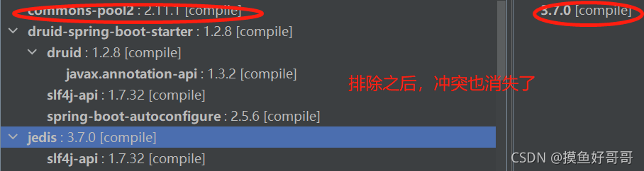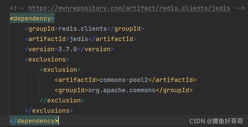 2)依赖的排除:如果在项目中出现有部分jar包可能会对项目造成干扰、威胁或会引发一些依赖冲突以及其他不良影响的问题,并且你自己又改不了。遇上这种情况,则可以使用<exclusion> 关键字排除其jar包