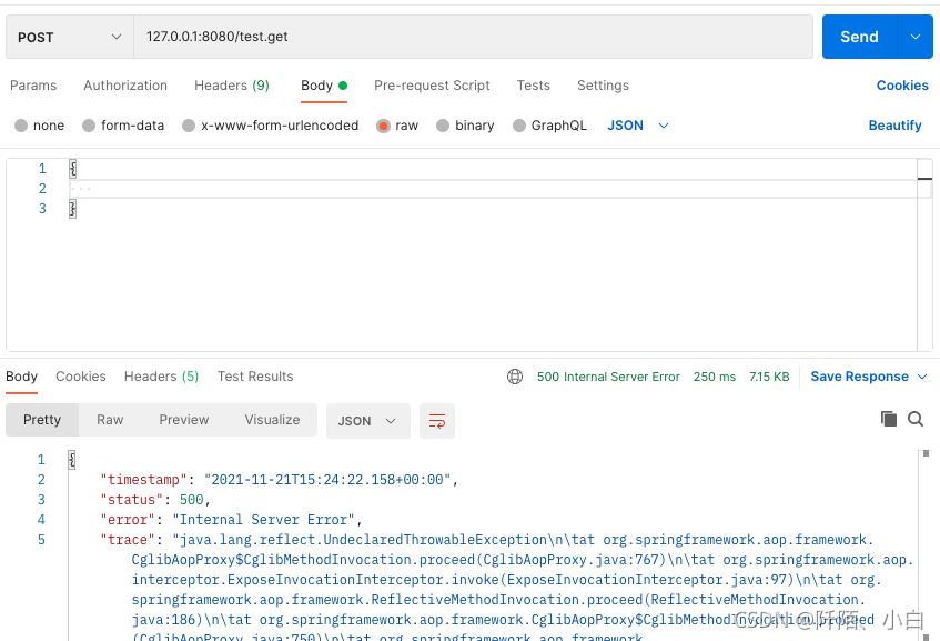 4.启动项目使用postman测试接口,但是报错了。java.io.IOException: Stream closed,这里报错是因为sevlert里面的body是流为inputStream读一次就结束了。ResponseBody是读一次,自定义的aop再通过sevlert去读的时候就已经关闭了无法读取。