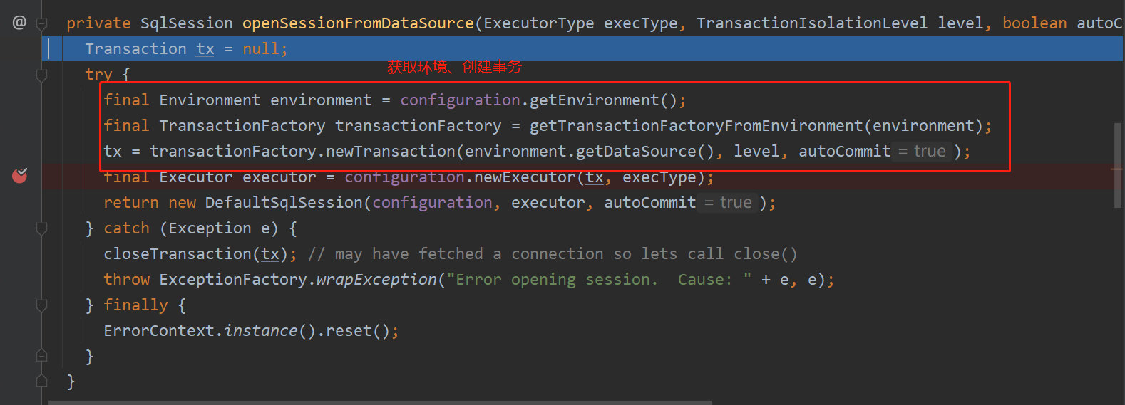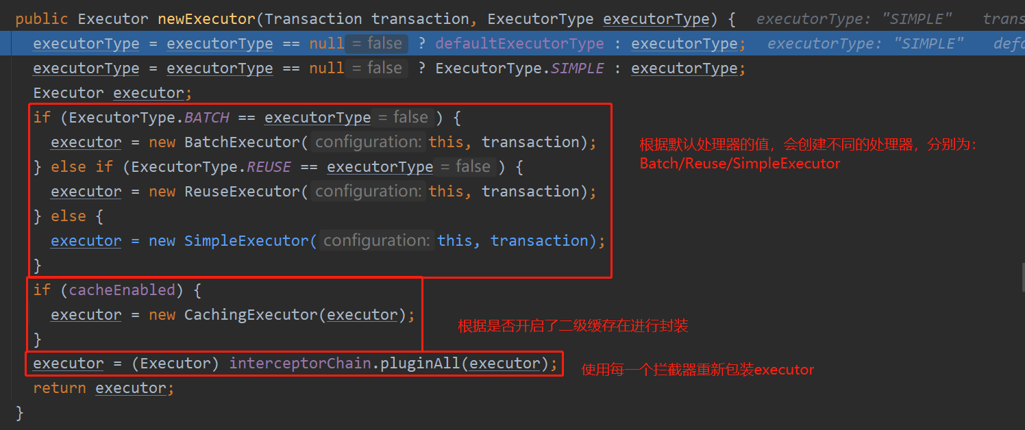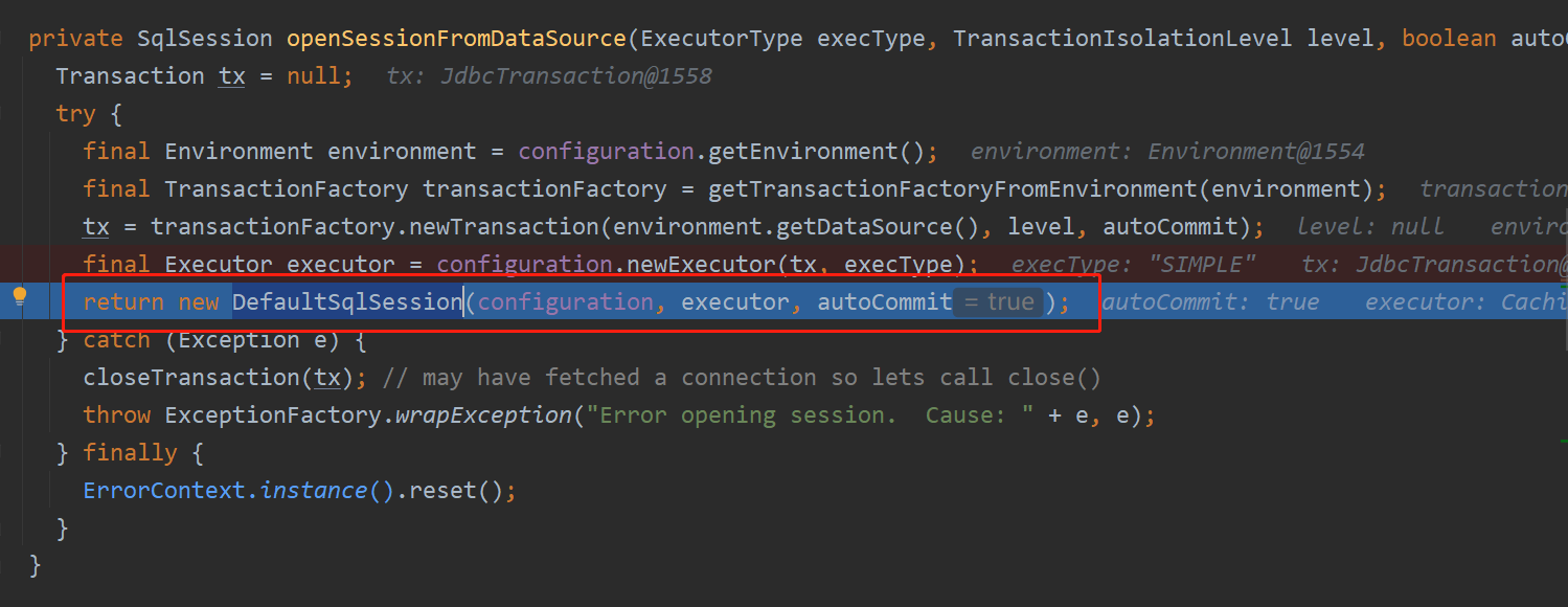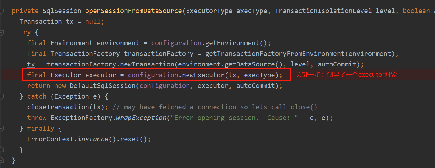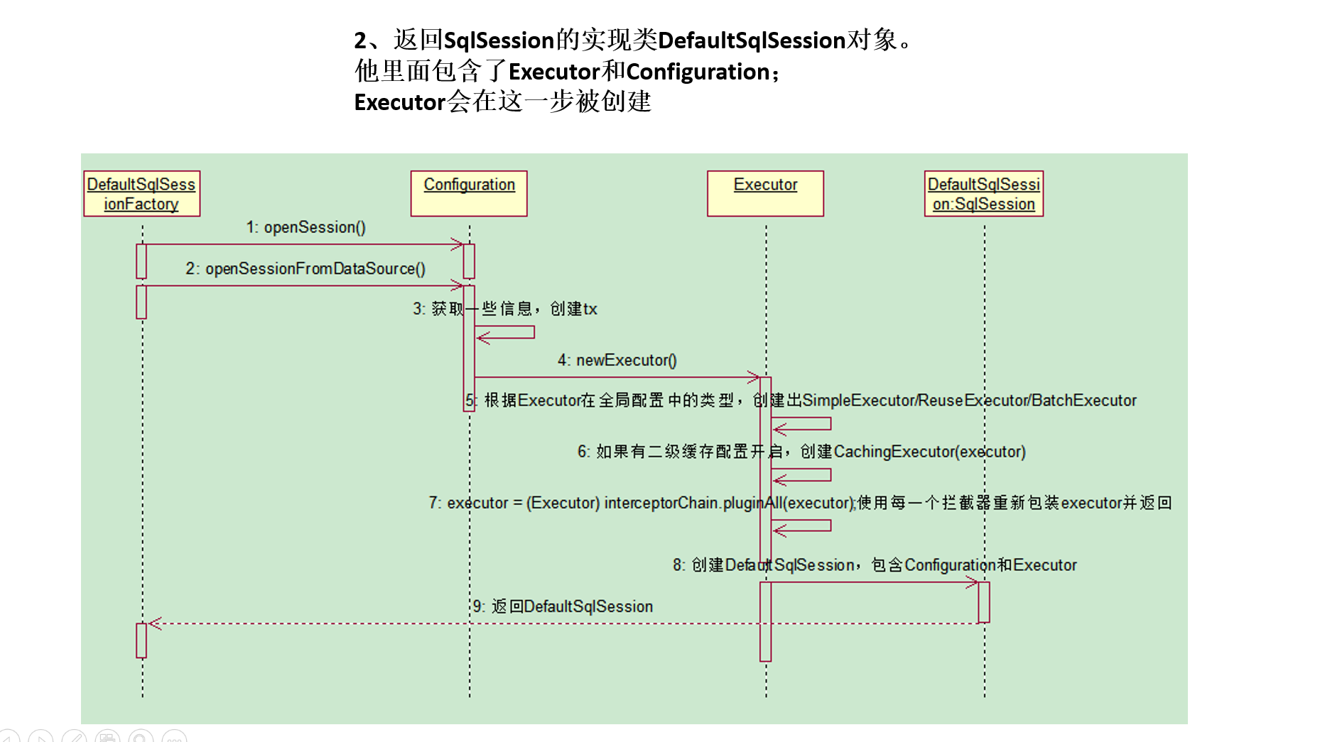 - 返回一个DefaultSqlSession对象,包含了Configuration对象和Executor对象(四大对象之一)