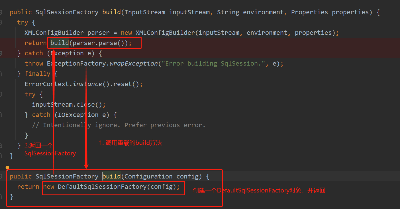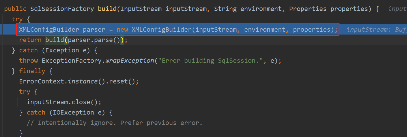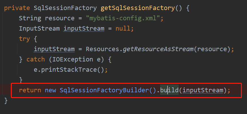 - 首先创建一个SqlSessionFactoryBuilder对象,然后该对象调用build方法并传入一个输入流,输入流读取了全局配置文件。