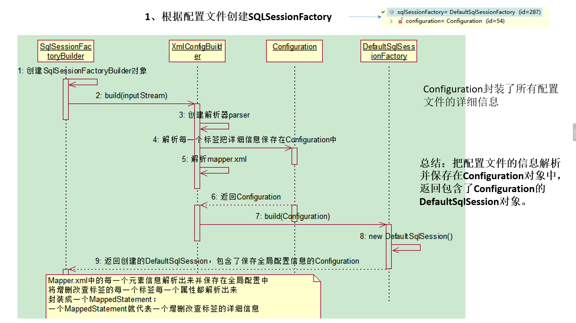 - 最后就创建了一个SqlSessionFactory对象,并且这个对象中保存了包含全局配置信息的Configuration。