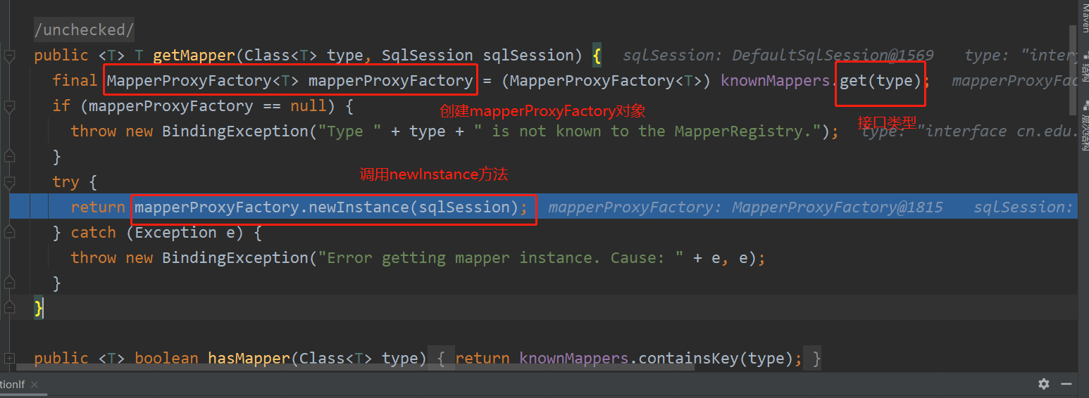 首先根据接口类型获取MapperProxyFactory对象mapperProxyFactory,然后mapperProxyFactory调用newInstance(sqlSession)方法  -