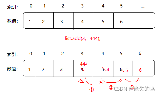 ?list.add(3, 444),索引为3, 4, 5位置需要往后挪一位,将所以为3位位置空出来,将444值设置到索引为3的位置。