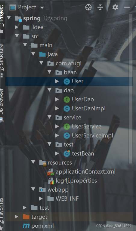 ?来简单的一个例子来理解一下控制反转, 新建四个包.bean,.service,.test,.dao