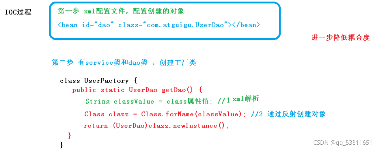 用户可以根据需求选择合适的UserDao的实现类,由程序员自行创建对象,程序只负责提供一个接口,这就是Ioc的原型。控制反转就是通过扫描注解或者xml文件,并通过第三方来获取特定对象的方式,String的IOC容器实现了控制反转。