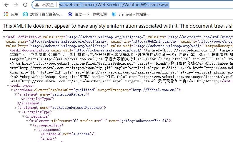 1,问题: java 调用.NET生成的webservice,会出现这个问题生成客户端代码报错 2,解决方案:因为这个服务是.NET开发的,所以我们在这一块要访问需要将wsdl的描述文件保存到本地,然后做一些更改 3、将wsdl_文件中的 <s:element ref=“s:schema”/><s:any /> 修改为 <s:any minOccurs=“2” maxOccurs=“2”/> 之后,以绝对路径的方式来生成对应的客户端代码即可 4、将wsdl描述保存到本地:右键查看源代码复制,本地新建weather.wsdl 粘贴进去 注意:<?xml 放在第一行,不允许有空   调用成功
