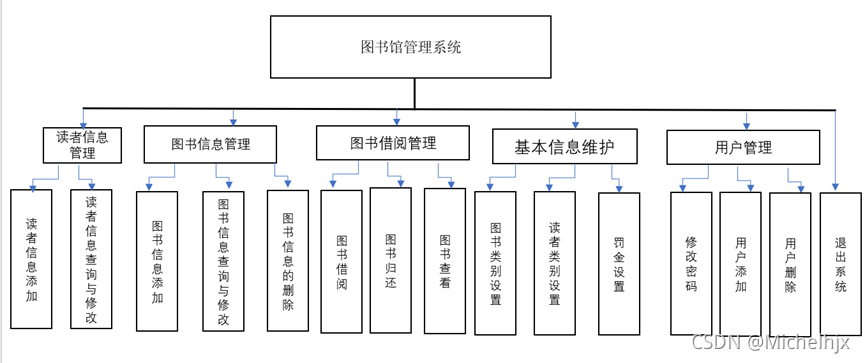 ? ? ? ? 从图中我们可以看出,这个系统分为五个模块。在这五个模块中有难度的就是第三个模块:图书借阅管理。在这里对代码详解就不过多的叙述,毕竟自己动手写出来的代码能运行成功才是最开心的。