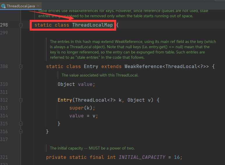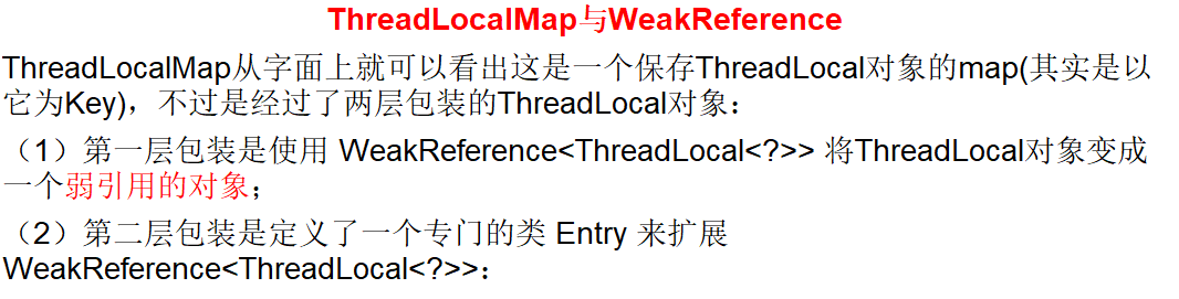 1 当我们为threadLocal变量赋值,实际上就是当前的Entry(threadLocal实例为key,值为value)往这个threadLocalMap中存放。Entry中的key是弱引用,当threadLocal外部强引用被置为null(tl=null),那么系统 GC 的时候,根据可达性分析,这个threadLocal实例就没有任何一条链路能够引用到它,这个ThreadLocal势必会被回收,这样一来,ThreadLocalMap中就会出现key为null的Entry,就没有办法访问这些key为null的Entry的value,如果当前线程再迟迟不结束的话,这些key为null的Entry的value就会一直存在一条强引用链:Thread Ref -> Thread -> ThreaLocalMap -> Entry -> value永远无法回收,造成内存泄漏。