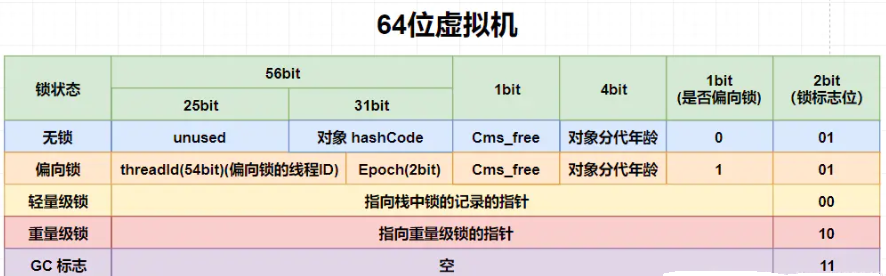- synchronized用的锁是存在Java对象头里的Mark Word中锁升级功能主要依赖MarkWord中锁标志位和释放偏向锁标志位