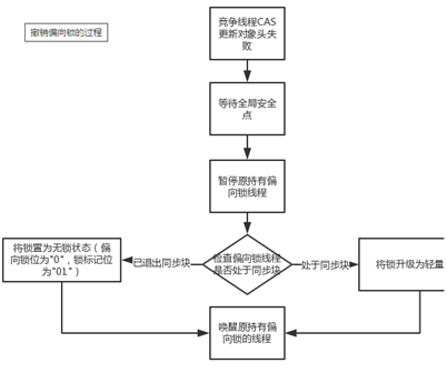 偏向锁使用一种等到竞争出现才释放锁的机制,只有当其他线程竞争锁时,持有偏向锁的原来线程才会被撤销。 撤销需要等待全局安全点(该时间点上没有字节码正在执行),同时检查持有偏向锁的线程是否还在执行:
