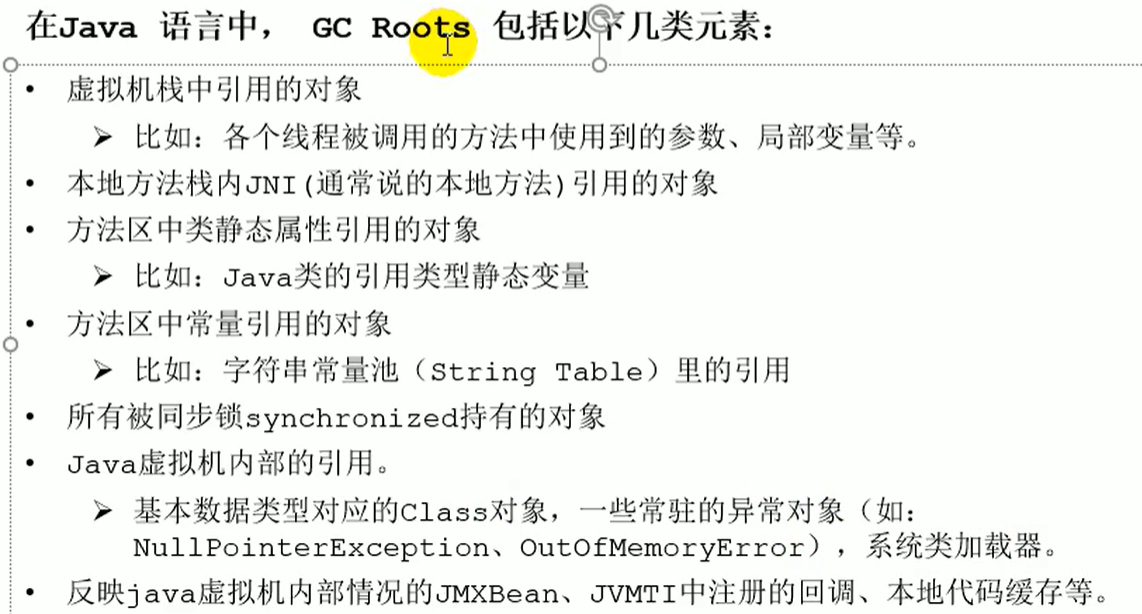 2 哪些对象可以作为GC Roots的对象: 1 虚拟机栈中引用的对象 2 方法区中的类静态属性引用的对象 3 方法区中常量引用的对象 4 本地方法栈JNI(Native方法)引用的对象