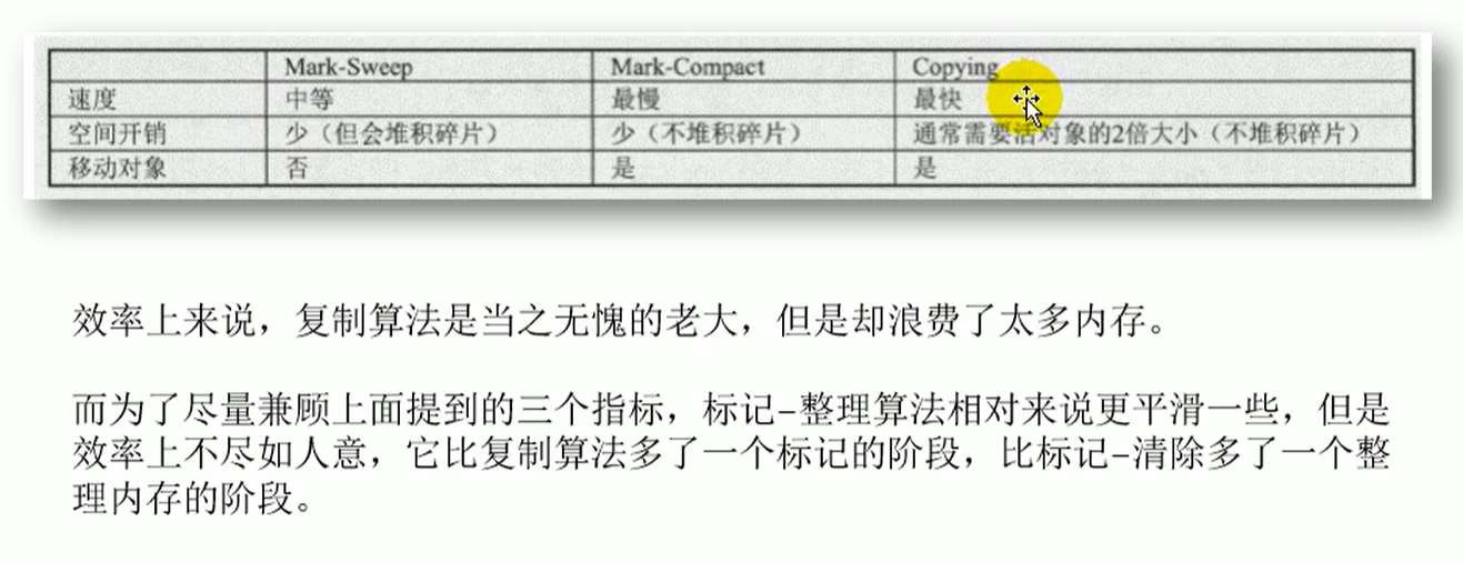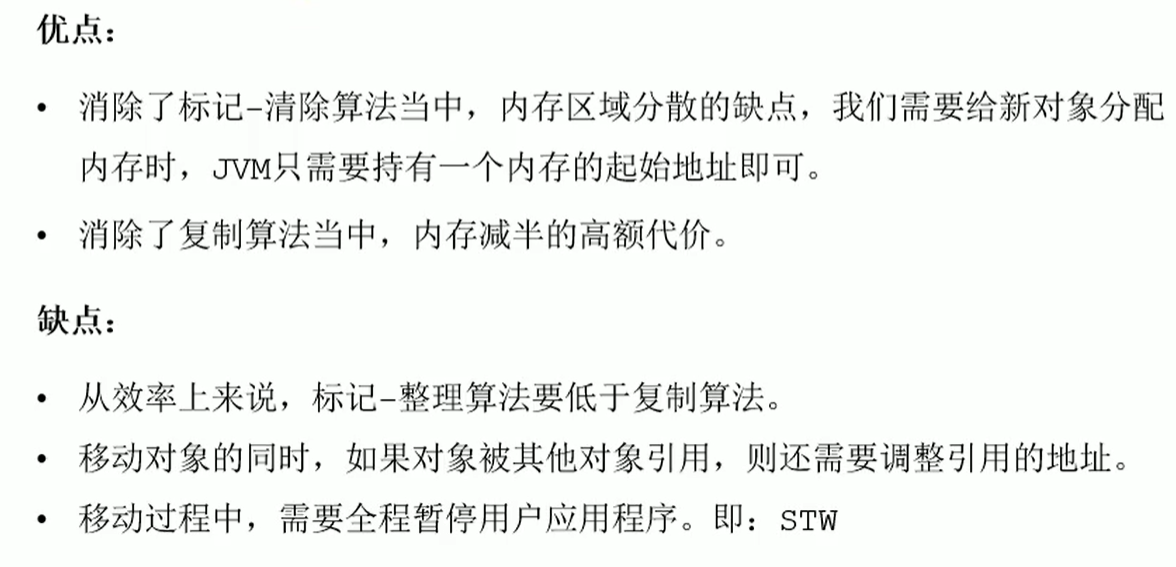1 背景 :改进于标记-清除法。  2 原理 标记-压缩算法的最终效果等同于标记–清除算法执行后,再进行一次内存碎片整理。  3 优缺点