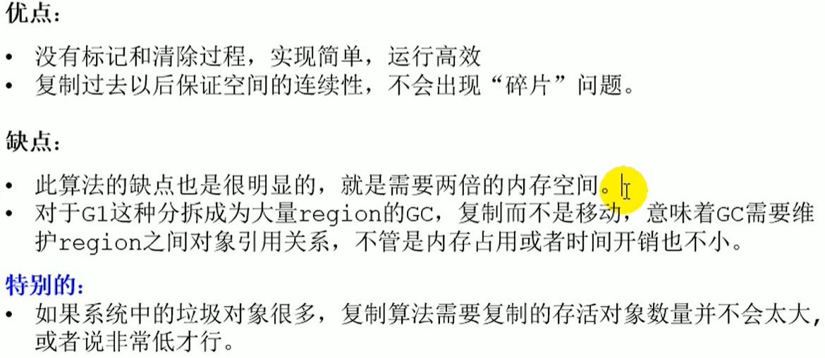1 原理  2 案例  3 复制算法的优缺点  注意适用场景:(存活对象少、垃圾对象多的情况下)大部分对象死亡,少量对象存活 复制到B区,----》新生代区 S0与S1区非常合适。