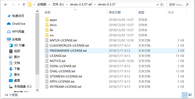 下载成功后,将 struts-2.3.37-all.zip 压缩包进行解压,解压后的目录如图所示。