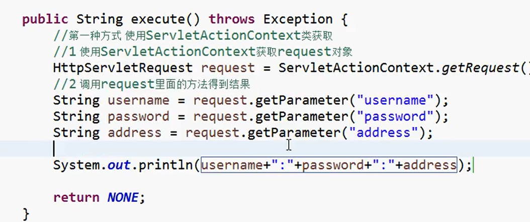 在上述 HelloWorldAction.java 中,execute() 方法的返回值 SUCCESS 是从父类中继承的常量字段,用于表示执行成功,并返回结果页面。