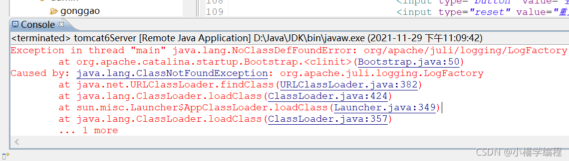 Exception in thread "main" java.lang.NoClassDefFoundError: org/apache/juli/logging/LogFactory ?? ?at org.apache.catalina.startup.Bootstrap.<clinit>(Bootstrap.java:50) Caused by: java.lang.ClassNotFoundException: org.apache.juli.logging.LogFactory ?? ?at java.net.URLClassLoader.findClass(URLClassLoader.java:382) ?? ?at java.lang.ClassLoader.loadClass(ClassLoader.java:424) ?? ?at sun.misc.Launcher$AppClassLoader.loadClass(Launcher.java:349) ?? ?at java.lang.ClassLoader.loadClass(ClassLoader.java:357) ?? ?... 1 more