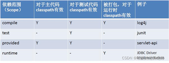 依赖范围scope 用来控制依赖和编译,测试,运行的classpath的关系. 主要的是三种依赖关系如下: