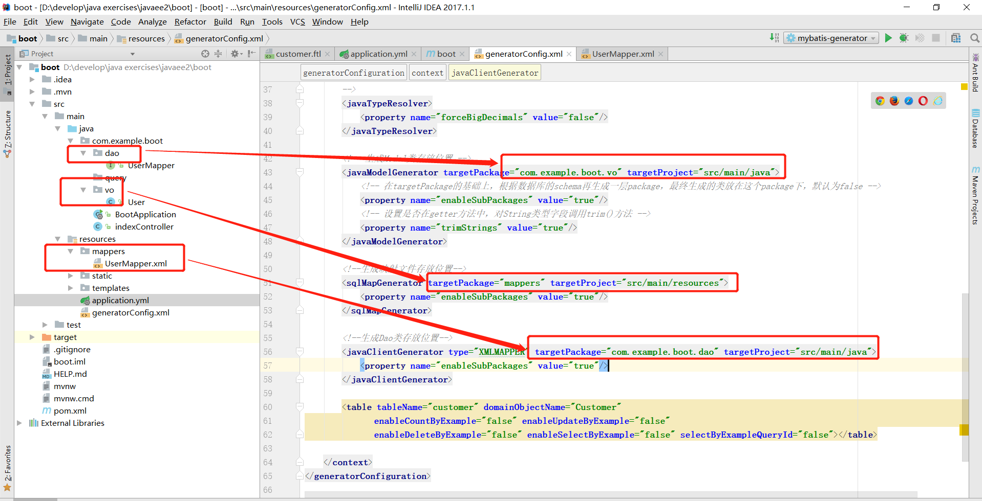 <javaClientGenerator type="XMLMAPPER" targetPackage="com.example.boot.dao" targetProject="src/main/java">