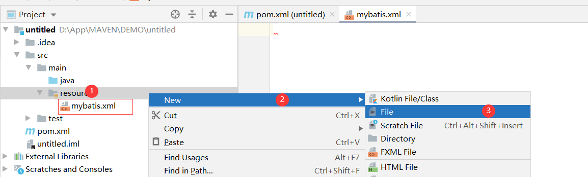 (2)首先在pom.xml中导入mybatis的jar包以及 mysql的驱动jar包,如下: