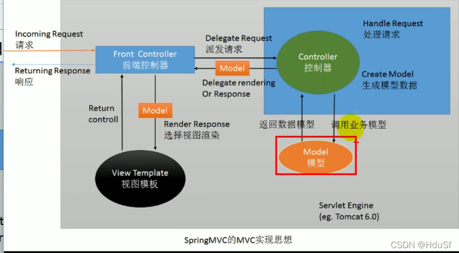 ?首先前端来了一个请求后会有一个前端控制器将这些请求派发到可以处理的控制器,相应的控制器再去调用Model层去处理这些请求返回数据模型,返回的数据模型又会到前端控制器那里,前端控制器再去寻找对应的视图来将这些数据渲染到页面,渲染完成之后再将这些页面响应回去。