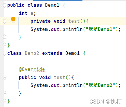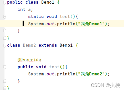 ? ? ? ??🔑:里面就是一个父类Demo1和子类Demo2,我们发现子类的test方法和父类test方法除了方法体内几乎是一模一样的。但我们只需要先暂时记住保证方法名和参数列表一致(悄悄和重载对比一下)。在方法体内他们是不同的,这就是一个方法重写,子类Demo2继承了父类的test()方法,但是重新书写了其中的内容。我们发现子类的test方法头上有一个@Override。这其实是一个注解(可能还没学习,但是不影响使用),当我们在子类重写方法时,在头上加一个@Override发现没有报错,就说明你的重写是正确的。@Override是一个我们判断是否方法重写是否成功且是否合理的注解,当不正确时它会报错。