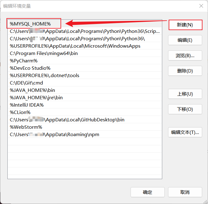 添加 MYSQL_HOME 变量,变量值为电脑 MySQL 的安装位置  添加 Path 系统变量