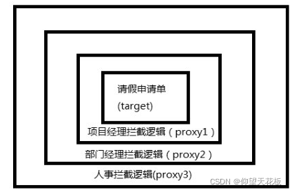 ?当一个对象在一条链上被多个拦截器处理就被称为责任链模式(拦截器可以选择拦截或者不拦截),它用于一个对象在多个角色中传递的场景。还是刚才的例子,申请单走到项目经理那,经理可能把申请时间“一周”改为“5天”,从而影响了后面的审批,后面的审批都要根据前面的结果进行。这个时候可以考虑用层层代理来实现,就是当申请单(target)走到项目经理处,使用第一个动态代理proxy1。当它走到部门经理处,部门经理会得到一个在项目经理的代理 proxy1基础上生成的 proxy2来处理部门经理的逻辑。当它走到人事处,会在proxy2的基础生成proxy3。如果还有其他角色,依此类推即可。