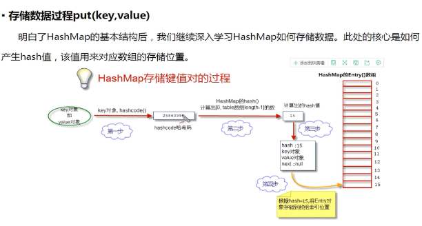 取数据过程get(key) 我们需要通过key对象获得“键值对”对象,进而返回value对象。明白了存储数据过程,取数据就比较简单了,参见以下步骤︰ (1)获得key的hashcode,通过hash()散列算法得到hash值,进而定位到数组的位置。 (2)在链表上挨个比较key对象。调用equals()方法,将key对象和链表上所有节点的key对象进行 比较,直到碰到返回true的节点对象为止。 (3)返回equals()为true的节点对象的value对象。 明白了存取数据的过程,我们再来看一下hashcode()和equals方法的关系︰ Java中规定,两个内容相同(equals()为true)的对象必须具有相等的hashCode。因为如果equals()为true而两个对象的hashcode不同;那在整个存储过程中就发生了悖论。 扩容问题 HashMap的位桶数组,初始大小为16。实际使用时,显然大小是可变的。如果位桶数组中的元素达到(0.75*数组length),就重新调整数组大小变为原来2倍大小。 扩容很耗时。扩容的本质是定义新的更大的数组,并将旧数组内容挨个拷贝到新数组中。