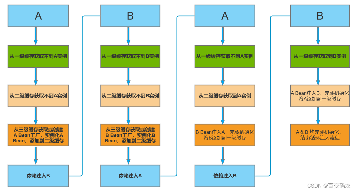 下面以Bean A 和 B二者的简单循环依赖注入为例解说: