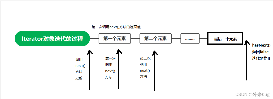 在迭代器中存在连个方法,第一个是<>.hasNext()方法:判断集合中是否存在下一个元素,如果存在那么用<>.next()方法将元素取出来;否则说明已到达集合末尾,停止遍历。Iterator迭代器在遍历集合时,内部采用指针的方式来跟踪集合中的元素。