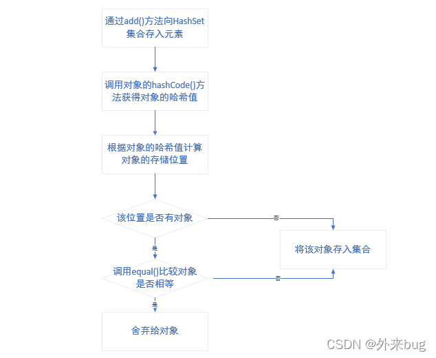 当向HashSet集合中添加一个对象时,首先会调用该对象的hashCode()方法来计算对象的哈希值,来确定对象的存储位置,如果此时哈希值相同,在调用对象的equals()方法来确保该位置没有重复元素。