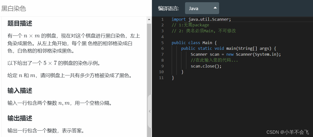 这个拿纸画一下就OK,当n*m为奇数时,输出的数为(n*m)/2 +1,偶数时为(m*n)/2