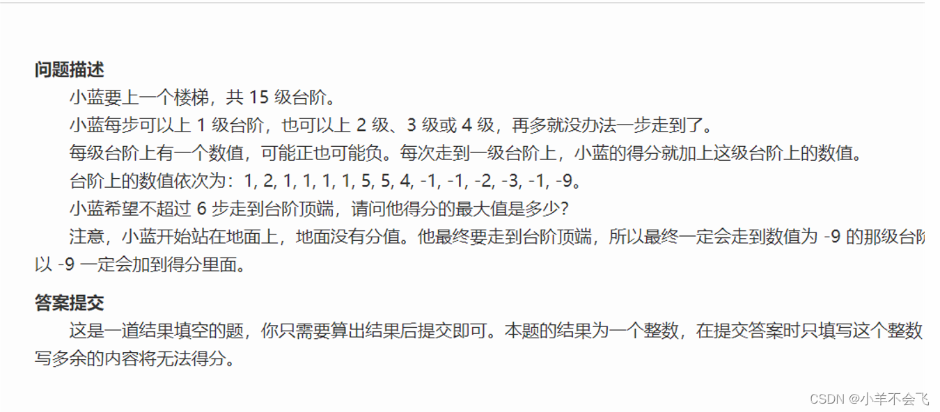 这个题目因为台阶数值给定并且比较小,可以直接在草稿纸上写,1到5到5到4到-1到-9是得分为最大值的走法,没有什么难度