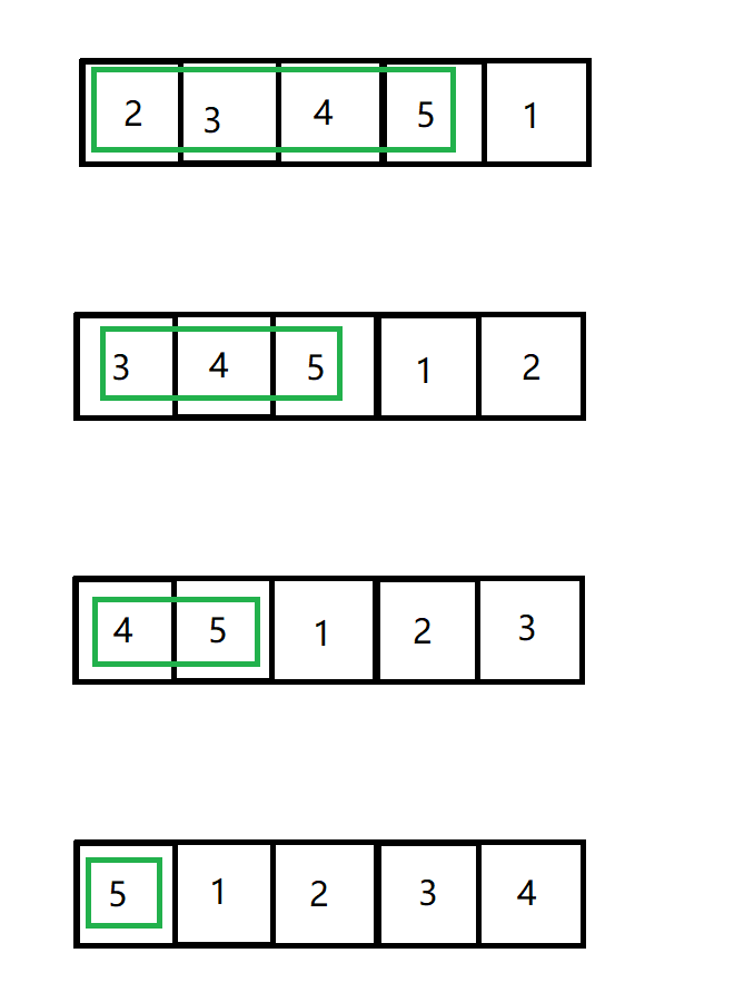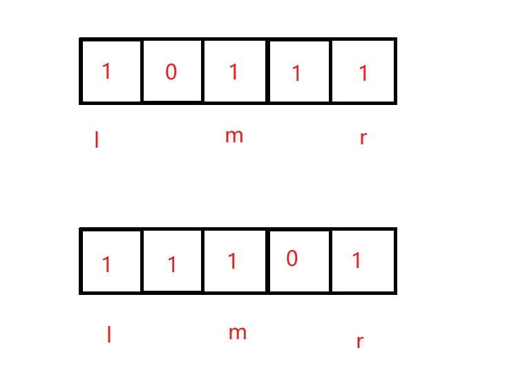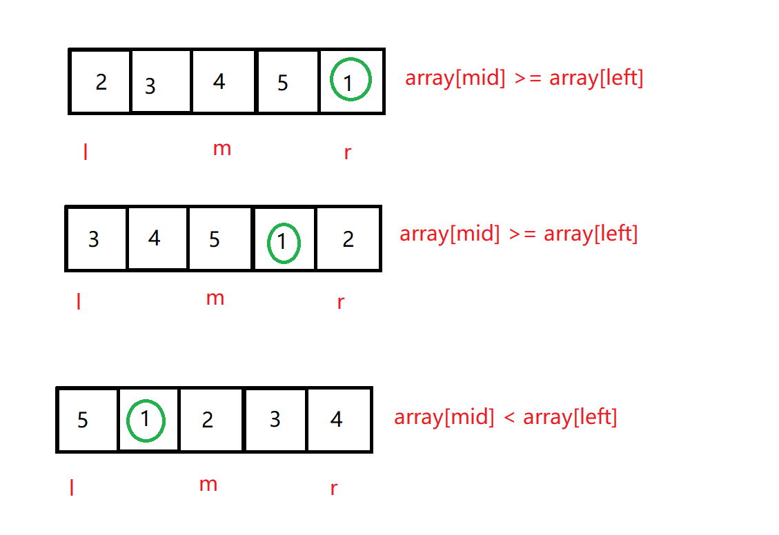 第一种情况,中间数字下标为2,位于后面的子数组; 第二种情况,中间数字下标为2,位于前面的子数组中。